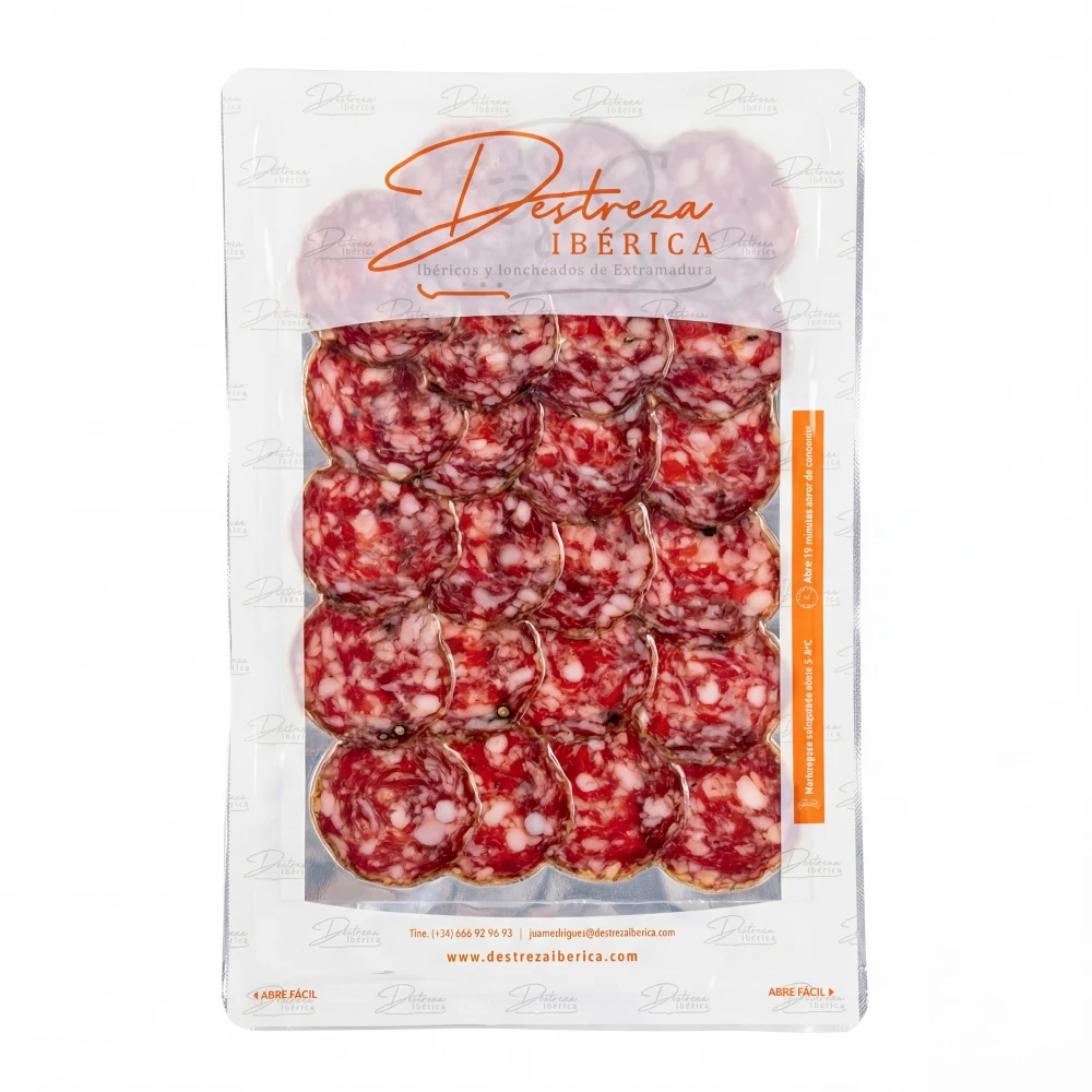 El salchichón ibérico loncheado en sobres de 80 gramos es la forma más cómoda de disfrutar de un embutido tradicional sin renunciar a su autenticidad. Elaborado en Extremadura con carnes ibéricas seleccionadas, aderezado con pimienta negra y especias naturales, y curado lentamente para conseguir una textura firme y un sabor equilibrado y aromático.
